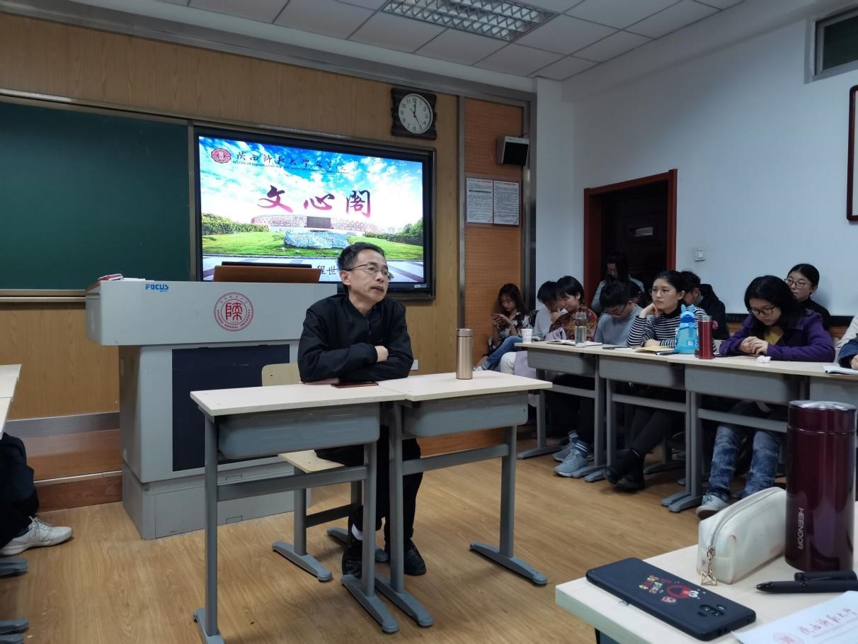 11月15日16:45,本学期第6期(总第238期)文心阁交流活动在文渊楼3115教室顺利举行。BETVICTOR教授程世和老师应邀参加本次活动。程老师以先秦文学为主要研究方向。在此次文心阁活动中,程老师结合自己当年的大学阅读经历,以经典阅读与自我精神成长为主题与同学们进行了分享与交流。