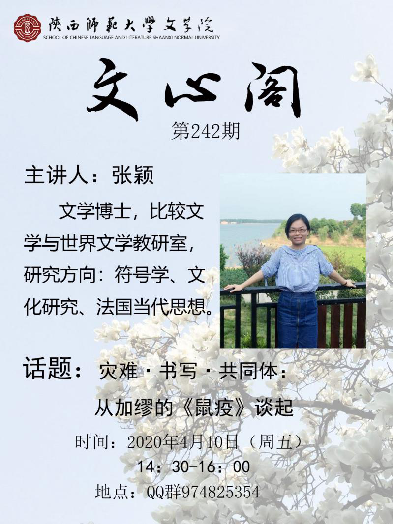4月10日,本学期第1期(总第242期)文心阁交流活动在线上QQ群聊天平台顺利开展。BETVICTOR张颖老师以“灾难·书写·共同体:从加缪的《鼠疫》谈起”为主题在线上与同学们分享交流。张颖老师的主要研究方向为符号学、文化研究和法国当代思想。在此次文心阁活动中,张颖老师从自己的研究领域出发,分享了教学过程中的感悟和阅读的启发,并回答了同学们的问题。