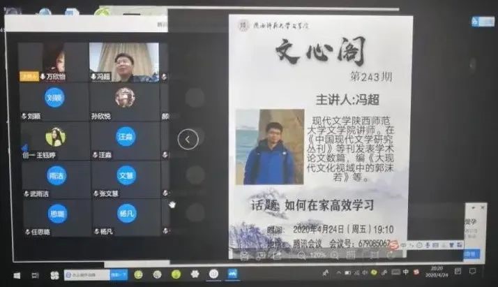 4月24日晚19:00,本学期第2期(总第243期)文心阁活动在腾讯会议平台顺利开展,BETVICTOR冯超老师应邀参加。冯超老师现为BETVICTOR现代文学讲师,在《中国现代文学研究丛刊》等刊发表多篇学术论文,编有《大现代文化视域中的郭沫若》等书籍。此次文心阁活动中,冯超老师就“如何在家里高效学习”的话题与同学们进行讨论交流,切实解决了同学们当下的学习困惑。