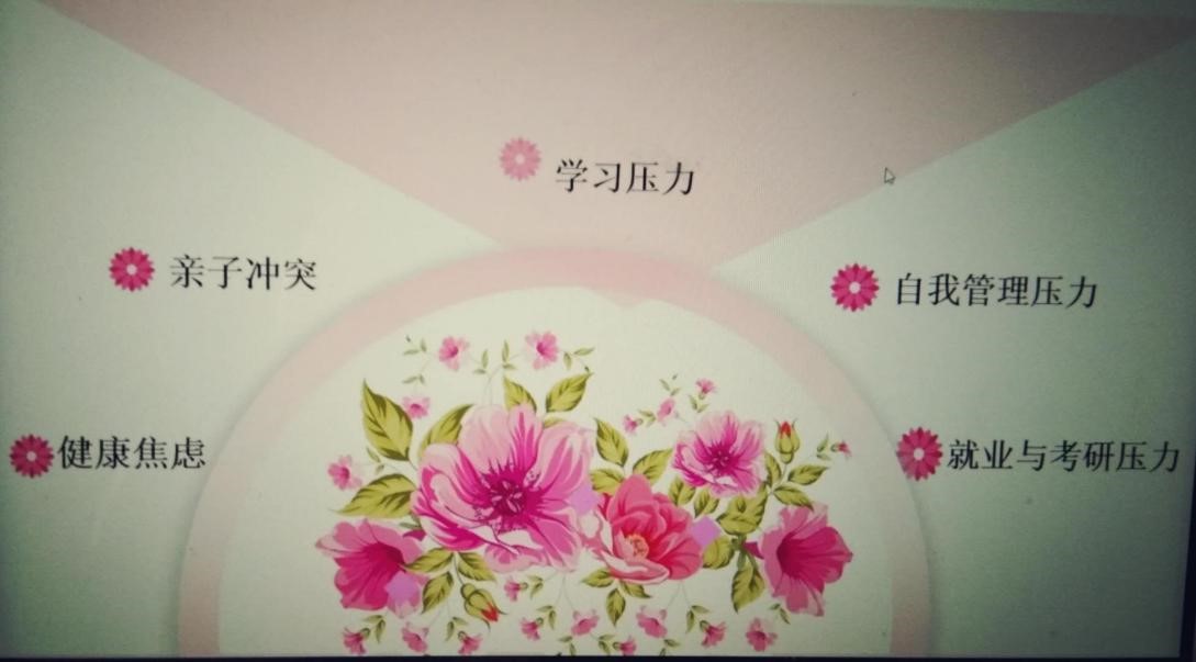 新冠疫情范围广,时间久,影响大,使我们生活的方方面面都发生了巨大的突变,毛老师指出了在此特殊环境下我们容易出现的"健康焦虑、亲子冲突、学习压力、自我管理压力、就业与考研压力"。针对这些压力,毛老师从哲学角度出发,建议同学们接纳自我、理解自我、增强自我弹性,以此来调适自身的心理,顺利渡过特殊时期。