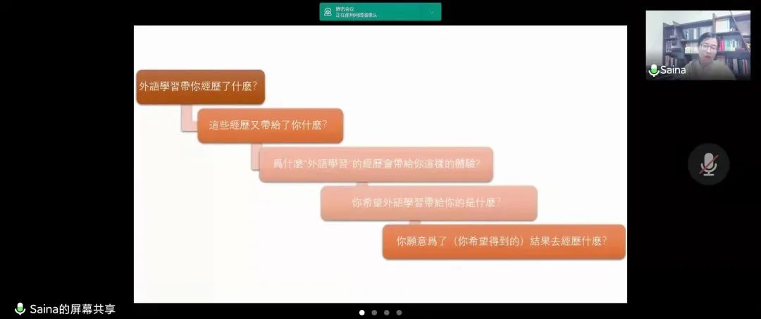 乌云老师的分享从“外语学习带你经历了什么”深入到“这些外语学习的经历又带给你什么”、“为什么外语学习会带给你这样的经历”,再到“你希望外语学习带给你的是什么”,最后是“你愿意为了你希望得到的结果经历什么”,层层递进,娓娓道来。