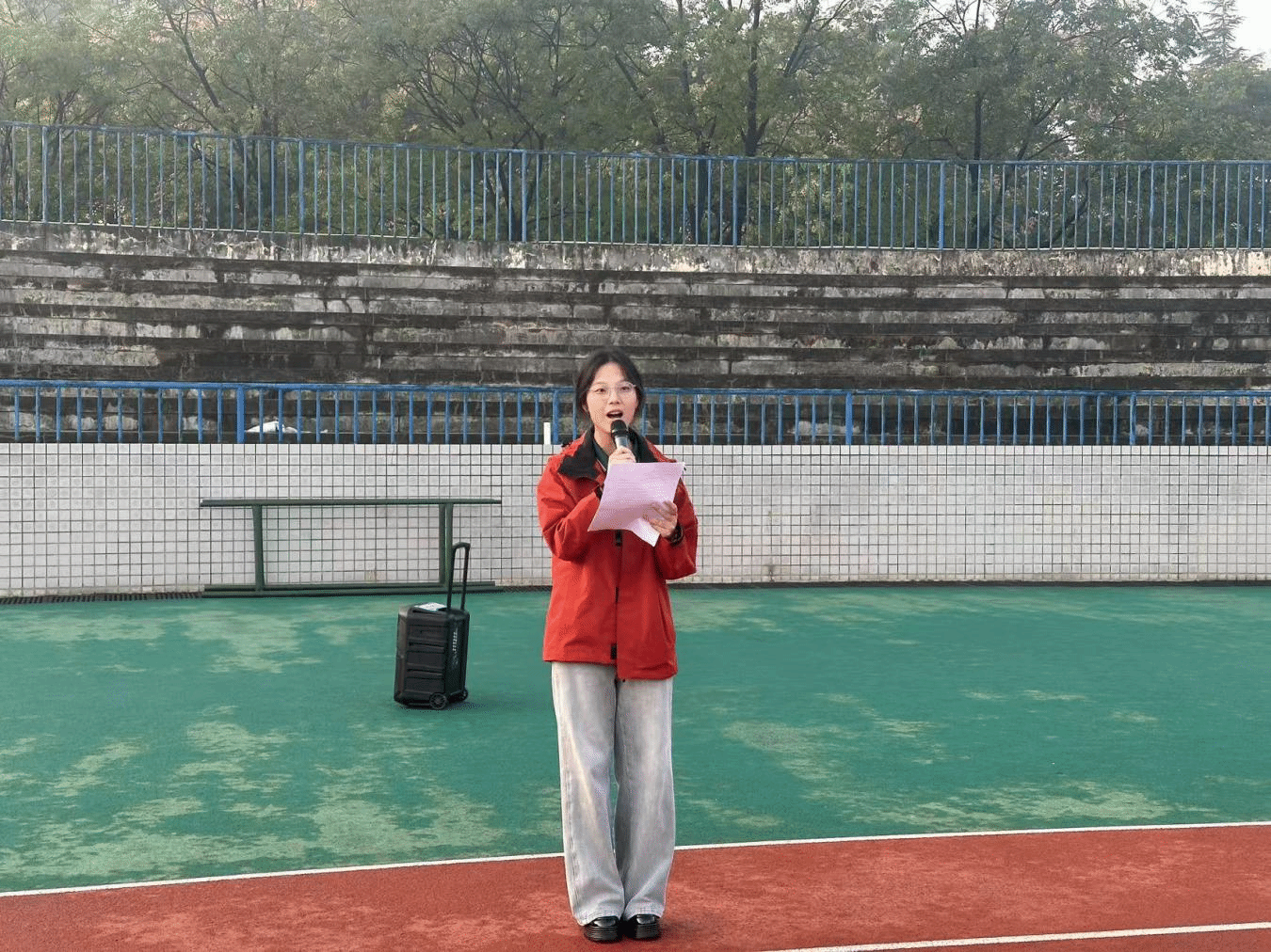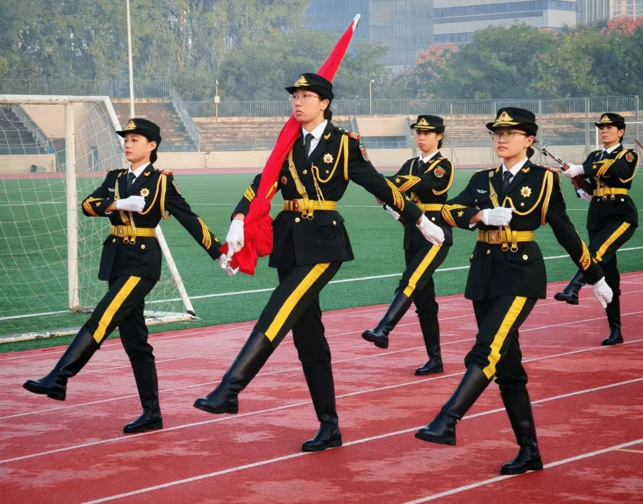 晓日初升,田径场上一派庄严静穆。国旗护卫队迈着铿锵步伐,护送国旗,走向升旗台。随着《义勇军进行曲》的雄壮旋律响起,鲜艳的五星红旗冉冉升起,全体师生肃立注目,齐唱国歌,响彻全场。