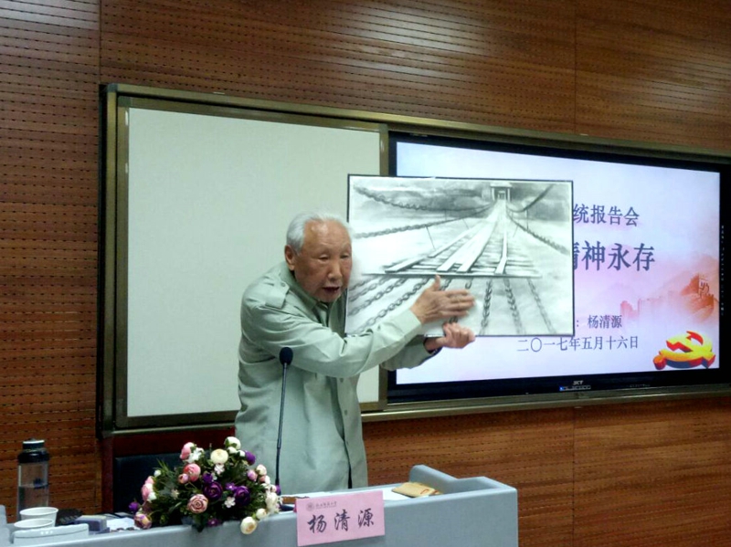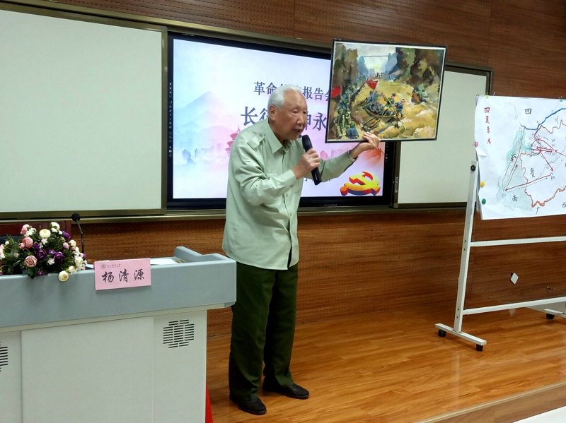杨清源教授以“弘扬伟大长征精神,走好今天的长征路”为主题,用真挚的情怀、深切的情感,通过鲜活的事例、生动的语言,从“红军为什么要长征、红军四渡赤水河、红军飞夺泸定桥、红军过雪山草地以及弘扬伟大长征精神”五个方面再现了红军长征的艰苦历程,分享了他对长征精神的理解。同时,他还立足国情,指出学习长征精神对于今天的重大意义,受到师生的欢迎和好评。他不畏辛劳,无私奉献的精神,令现场师生深深敬佩。