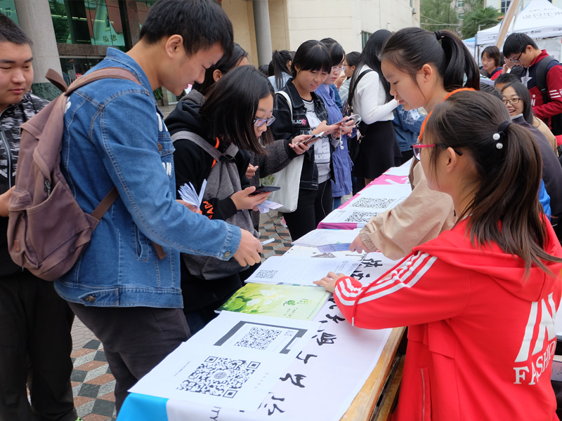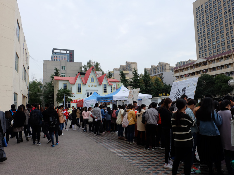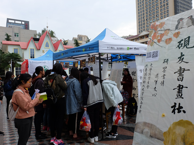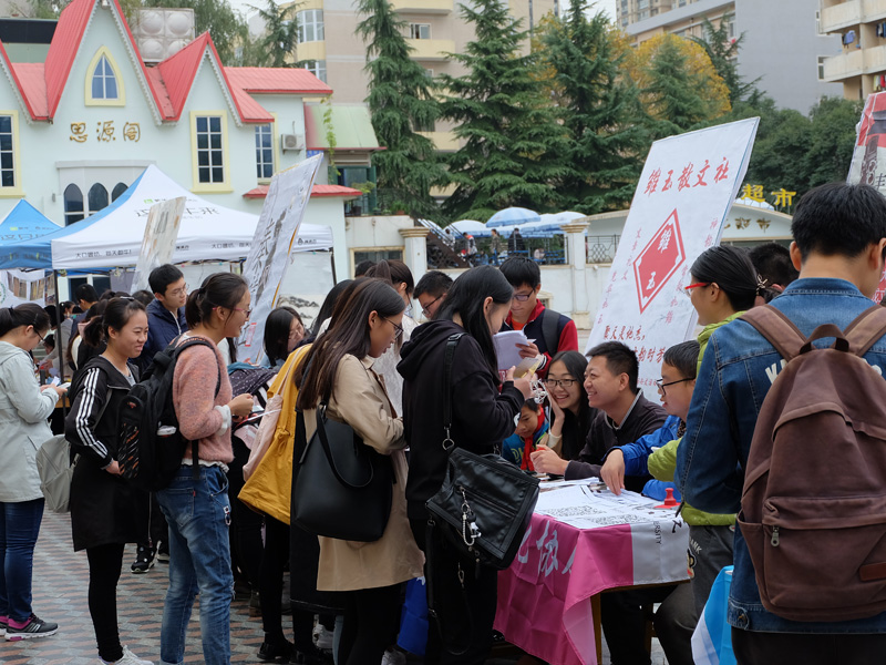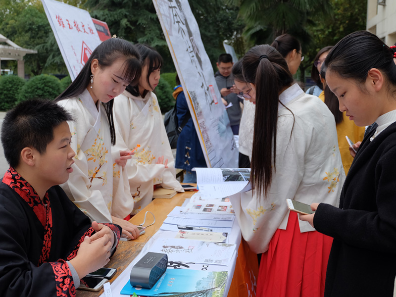 早上七点,各个社团的宣传负责人陆续进入指定位置,为同学们的到来紧张而积极地准备着。上午九点,各个社团的活动陆续展开。砚友书画社笔走龙蛇,与墨为友、与古为徒,挥洒青春风采;长风文学社的学长学姐们耐心的为大一的同学们解答着有关文学方面的知识;秦风诗社古风古韵,用低吟浅唱、长赋短歌吸引着员工的目光;雕龙文化协会借文入胜,品读经典永恒;电影爱好者协会同道者众,各抒己见,好不热闹;入戏话剧社则是能文能武,亦动亦静,引得笑声连连;雏玉散文社用一首首清新优雅的三行诗传达出了温柔缱卷的文学意味。同学们积极地参与到社团举行的活动中,抽签答题,写散文诗,更有一些同学身着汉服,为喷泉广场更添一抹盛唐风情。