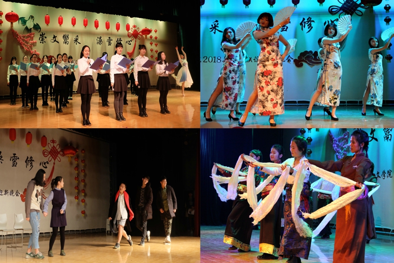 曲动魄,舞飘飖,铿锵有力的鼓点和鲜艳灵动的红绸喜庆祥和,歌舞节目《好运来》拉开了迎新晚会的序幕。《春知晓梦》、《舞乐春秋》为观众带来了美的享受,旗袍水袖,婉约柔美,一颦一笑,动人心弦; 2015级员工呈现的舞蹈《全部都是你》则充满着惊喜和欢笑,师生互动,掌声不断,且歌且舞,活力四射。文苑社团联合展示的《将进酒》和17级新生带来的原创诗歌朗诵《青灯》,用抑扬顿挫的诗句吟诵出学子的深厚底蕴,用悠扬婉转的曲调歌唱出文苑的赤子深情。字里行间、饱含赞美,文辞断句、潜隐祝福。由辅导员秦亚坤老师和研究生代表表演的戏曲联唱古风古韵,唱腔细腻,别具风味;小品《你好,李焕英》、《家长会》则着眼于社会热点问题,触觉敏锐新颖,情感充沛自然,嬉笑怒骂,戏说人生。研究生同学们带来的节目《青春组歌》旋律曼妙,嗓音迷人,诉尽柔情,展现出学子们积极向上的靓丽风采。《天下相亲与相爱》在员工会与研究生会主席团动感的舞蹈中开场,学工组的老师们依次上台一展歌喉,掀起全场高潮。