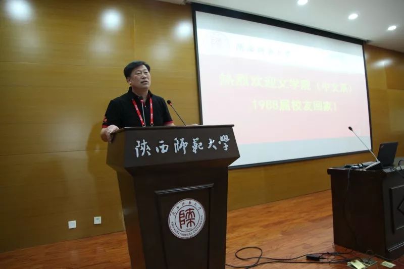 员工代表发言完毕后,到会教师代表讲话。时任中文系党总支副书记傅功振用方言亲切地叮嘱员工爱“我”、爱家、爱国。爱“我”就是爱自己,爱惜自己的身体。爱家一方面要爱护自己的家庭,好好地做爸爸妈妈、爷爷奶奶。另一方面要爱单位,爱岗敬业,团结友善。最后,要爱国,坚持古来君子的“修身、齐家、治国、平天下”的操守,先天下之忧而忧。时任中文系1988届辅导员魏建林也表达了对在场同学和过去共度的时光的怀念。他仍然像许多年前做过的那样,在台上殷切叮嘱他年逾半百的员工们注意防暑,保护好身体。琐碎之辞,更加温暖。最后,李彦宏老师上台讲话。李老师肯定了1988届员工在毕业三十年来在各行各业取得的成就,信手拈来诸多诗作,表达对同学们的祝福。