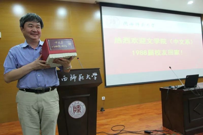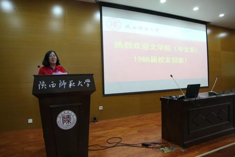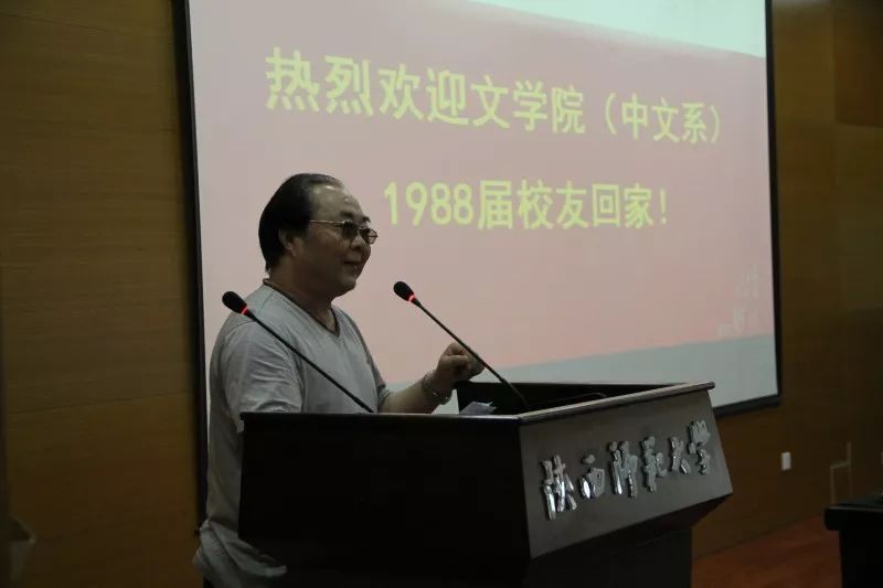 在此之后,四位1988届员工代表上台发言。“感谢”与“祝愿”是他们共同的主题,“回忆”与“怀念”是他们不变的旋律。 他们感谢老师呕心沥血的培养和孜孜不倦的教诲;他们感谢师大优良的学习环境和扎实严谨的学风;他们感谢时代给与的精神文化的幸福感。他们也许下祝愿。祝愿母校发展振兴、祝愿老师长寿安康、祝愿同学平安幸福。他们说:“不管我走到哪里,不管做什么工作,师大中文系,始终是我的根,始终牵着我的魂。”