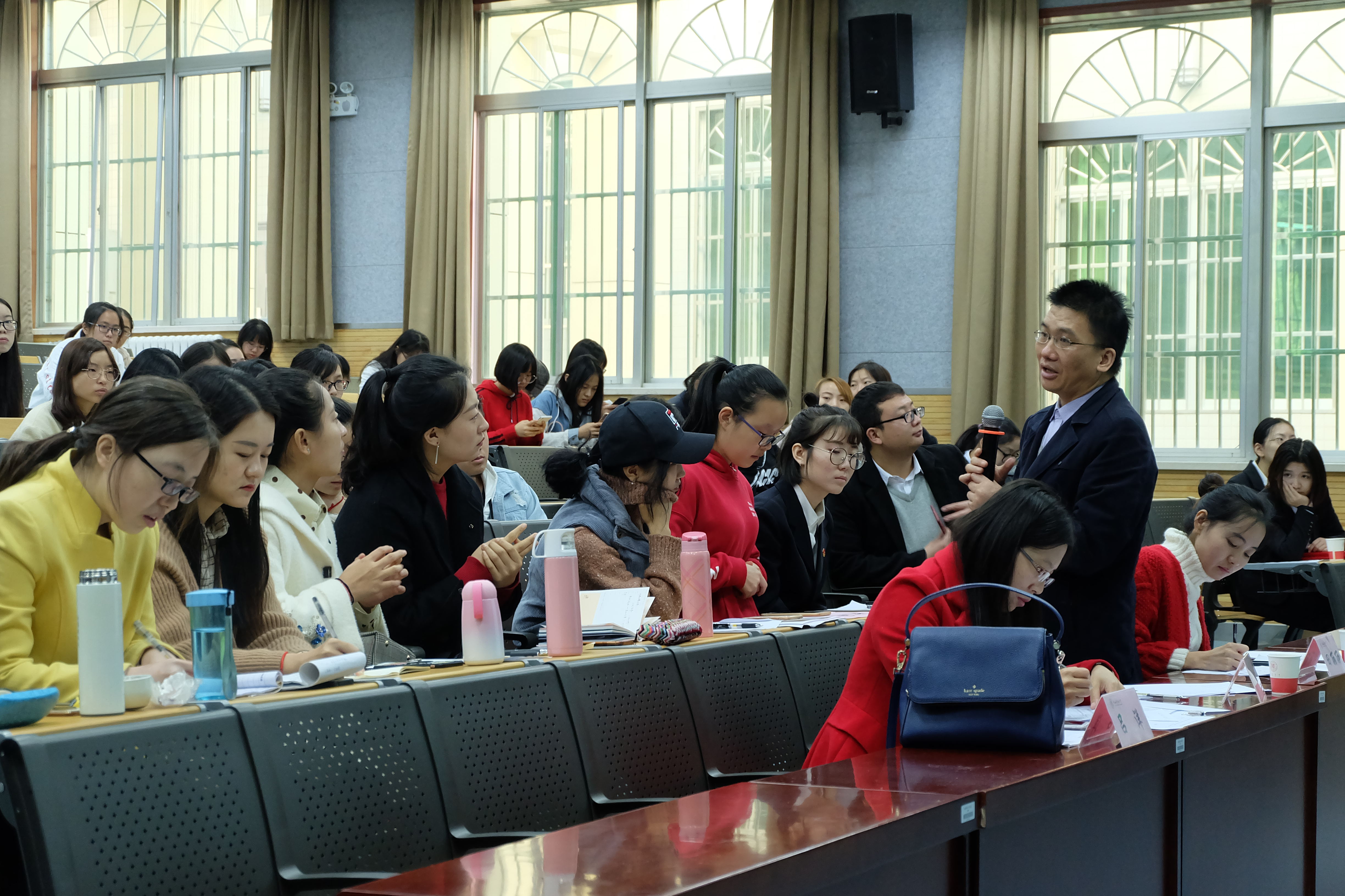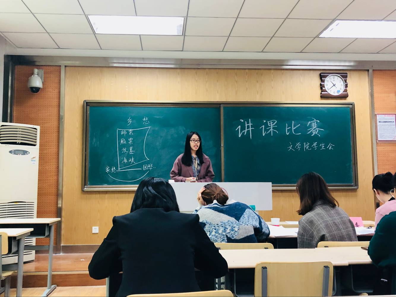 10月27日,讲课比赛进入决赛阶段。课程教学论研究室王元华、吕洋、李军亮、比较文学与世界文学教研室康洁以及古代文学教研室陈刚担任决赛评委。参赛选手们熟练运用多媒体以及其他教学辅助工具,灵活开展教学设计,为以“教”为中心的教学向以“学”为中心的教学转变做了有益尝试。评委们对选手们的表现发表了精彩而中肯的评价。在全部选手展示完毕后,王元华老师作总结发言,他指出作为一名语文老师,在进行教学设计时要深入文本、逻辑清晰;同时讲课时要情感充沛,富有感染力。前来观赛的同学们也纷纷表示收获颇丰。