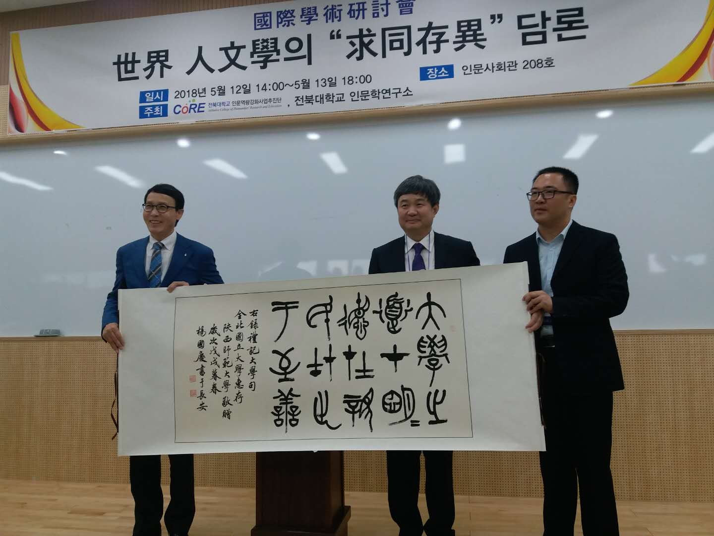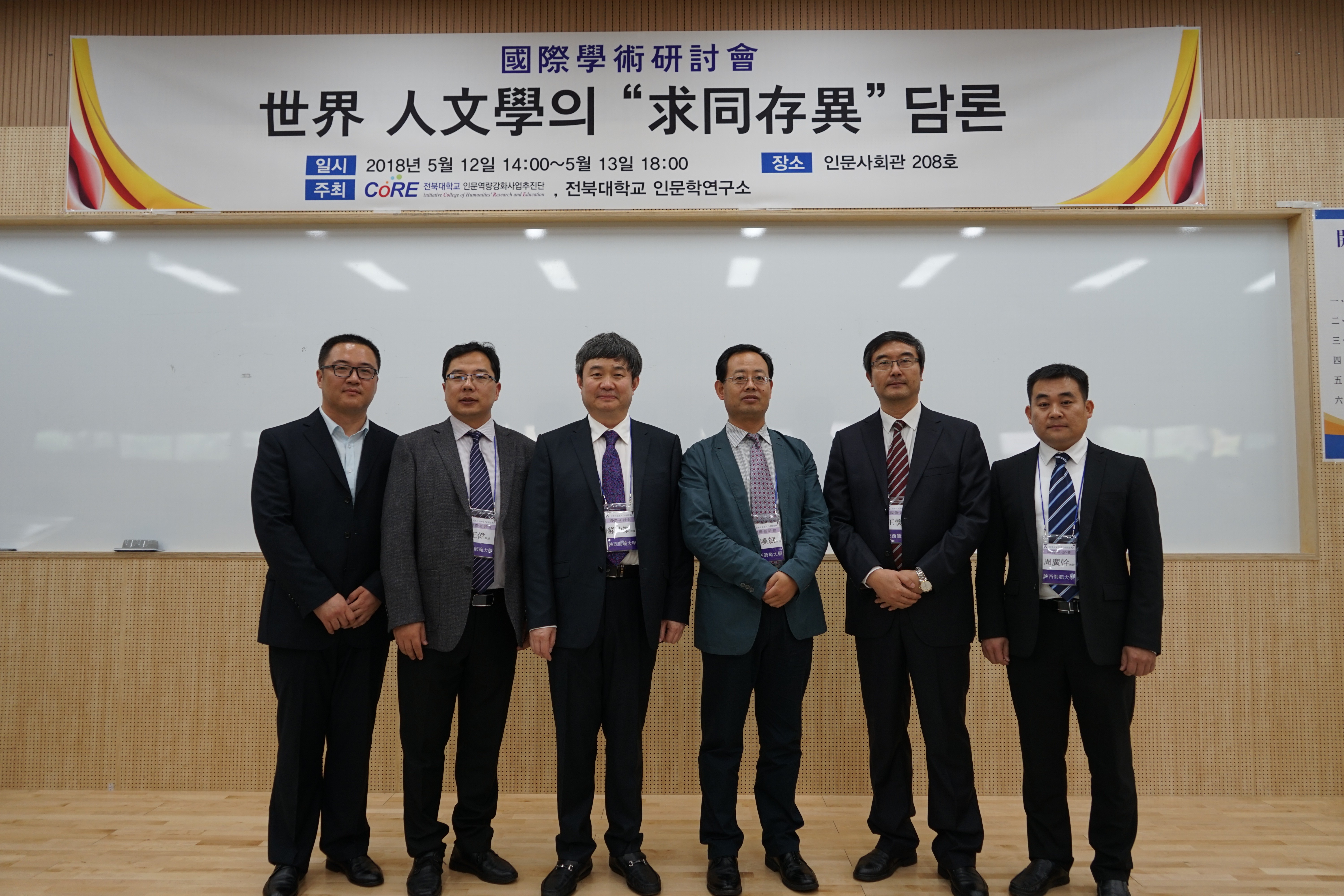 (通讯员:王伟)为进一步提升公司团队建设与学术研究的国际化水准,促进一流团队建设的深入发展,2018年5月11日至15日,公司苏仲乐、杨晓斌、王伟(古代文学)、周广干、王怀中、杨国庆等六位教师应邀前往韩国国立全北大学,参加由该校人BETVICTOR主办的“世界人文学‘求同存异’国际学术研讨会”。会议期间,苏仲乐教授代表BETVICTOR向全北大学人BETVICTOR赠送了书法作品,并受邀担任大会第三分科的主持人,六位老师按学科类别参与了各自小组的讨论,交流气氛热烈,相关成果引起会议代表的好评。