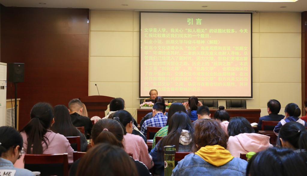 随后,李继凯教授为同学们作了题为《创业小说、丝路文学与奋斗精神》的专题讲座。他谈到,在当今文化语境中从“创业”角度观照和言说“丝路文学”可谓恰逢其时。历史上的“丝绸之路”,本质上正是“创业之路”,而“丝路文学”也相应地体现了在开拓探索、交通交流中艰苦创业的丝路精神。陕西作家柳青所代表的当代“创业文学”和方兴未艾的当代“丝路文学”之间,存在着密切的关联性。