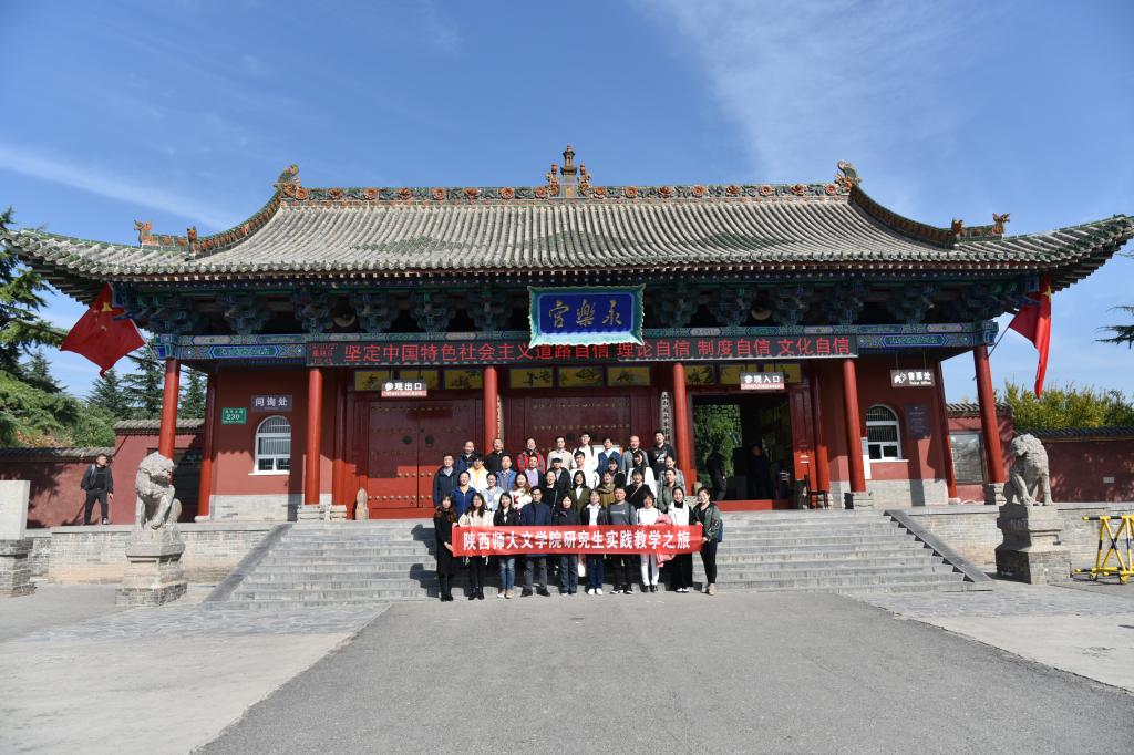 上午10时许,师生们到达本次文化考察的第一站——永乐宫。永乐宫现位于山西省芮城县城北,因其故址在永乐镇而命名。永乐宫为道教全真派三大祖庭之一,始建于公元1247年,是现存最大的元代道教宫观。永乐宫的壁画艺术驰名中外。在这里,同学们依次参观了三清殿、纯阳殿和重阳殿,在讲解员的带领下,师生们逐幅领略了永乐宫壁画的旷世风采。三清殿,是供“太清、玉属、上清元始天尊”的神堂,为永乐宫的主殿。殿内壁画高4.26米,全长94.68米,面积达403.34平方米,共有人物286个。纯阳殿,又名混成殿、吕祖殿。扇面墙后为《钟离权度吕洞宾图》,高3.7米,面积16平方米。重阳殿,是为供奉道教全真派首领王重阳及其弟子“七真人”的殿宇,殿内出采用连环画形式描述了王重阳从降生到得道度化“七真人”成道的故事。经历此行,大家深刻体会到了我国古代文化及绘画艺术的魅力;也感受到了当年进行搬迁重建时,在缺乏资金技术的情况下,建筑家、美术家、技工、农民工们顽强克服困难的爱国热情与文化担当。