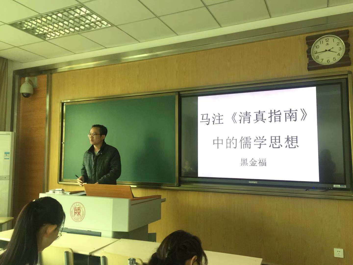 2019年11月4日,第142场博士学术报告以《马注<清真指南>中的儒学思想》为题,由中国古典文献学博士研究生黑金福主讲。鉴于同学们对其人其作不太熟悉,黑金福首先对马注及其著作进行了简单介绍,随后梳理了该书的版本。最后,黑金福对该书中体现的儒学思想进行分析,指出马注以儒释伊的思想是一以贯之的,他将伊斯兰教伦理与儒家伦理、社会道德与宗教道德熔为一炉,形成了具有中国特色的伊斯兰教伦理体系。