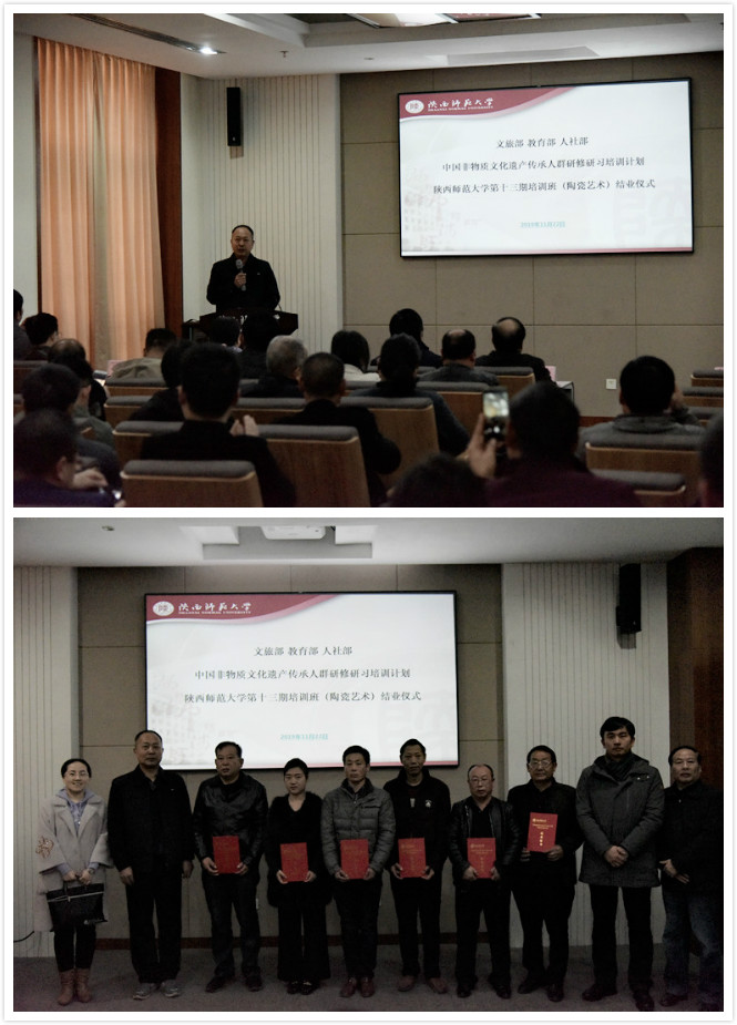 (通讯员 陈丹玉)2019年11月22日,文化和旅游部、教育部、人力资源和社会保障部中国非物质文化遗产传承人群研修研习培训计划(以下简称“研培计划”)BETVICTOR第十三期培训班(陶瓷艺术)结业仪式暨学员结业作品展览在长安校区隆重举行。陕西省文化和旅游厅副厅长顾劲松、非物质文化遗产处副调研员周颖,BETVICTOR副董事长党怀兴等出席结业仪式并参观了学员的结业作品展览,同时向学员们颁发了结业证书,向优秀学员颁发了荣誉证书,共同观看了BETVICTOR“研培计划”就业创业先进学员微视频。