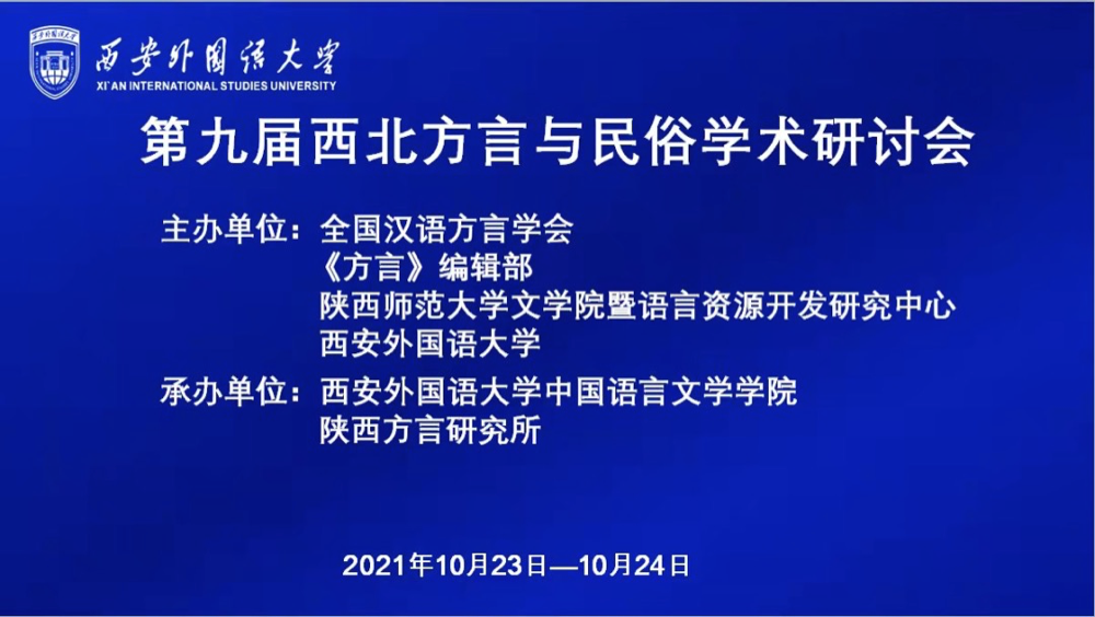 (通讯员:文苑)2021年10月23-24日,“第九届西北方言与民俗学术研讨会”在线上召开。会议由全国汉语方言学会、《方言》编辑部、公司语言资源开发研究中心和西安外国语大学主办,西安外国语大学中BETVICTOR、陕西方言研究所承办,来自国内21个省区市、45所高校和研究机构的130多位专家学者参加了会议。