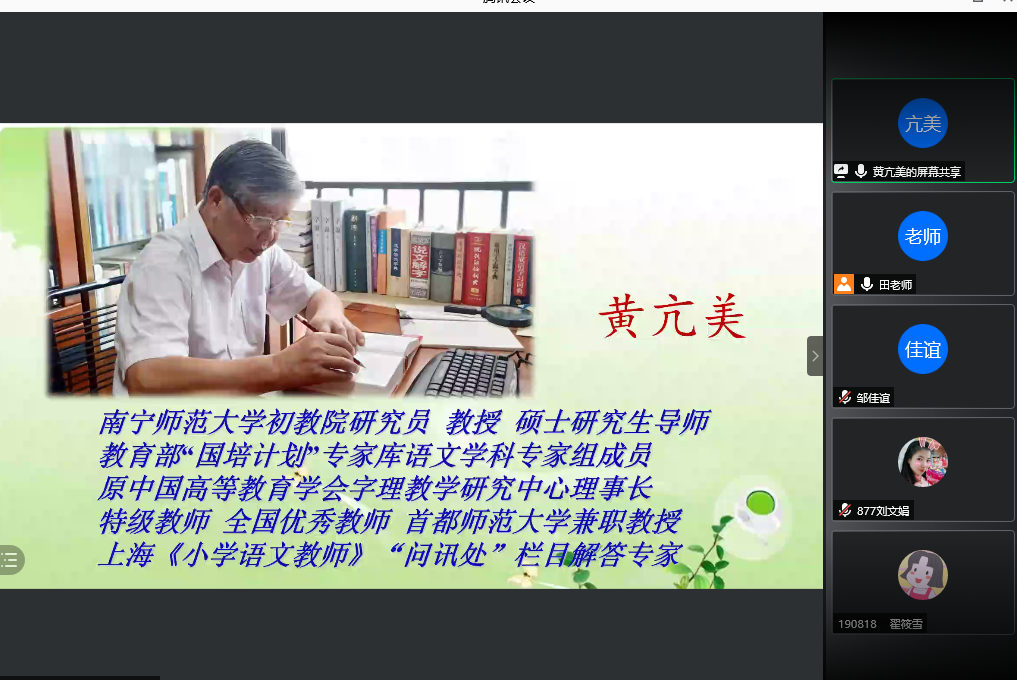 (通讯员:曹亚敏)2021年5月13日晚,“教师教育研习·名师讲坛”系列讲座第七场顺利举办。本场讲座特别邀请了南宁师范大学研究员黄亢美老师主讲,题目为“高师生应具有的汉字文化素养”。本次讲座由BETVICTOR教授贺卫东老师主持,通过腾讯会议线上开展,BETVICTOR大三、大四师范生聆听了本次讲座。