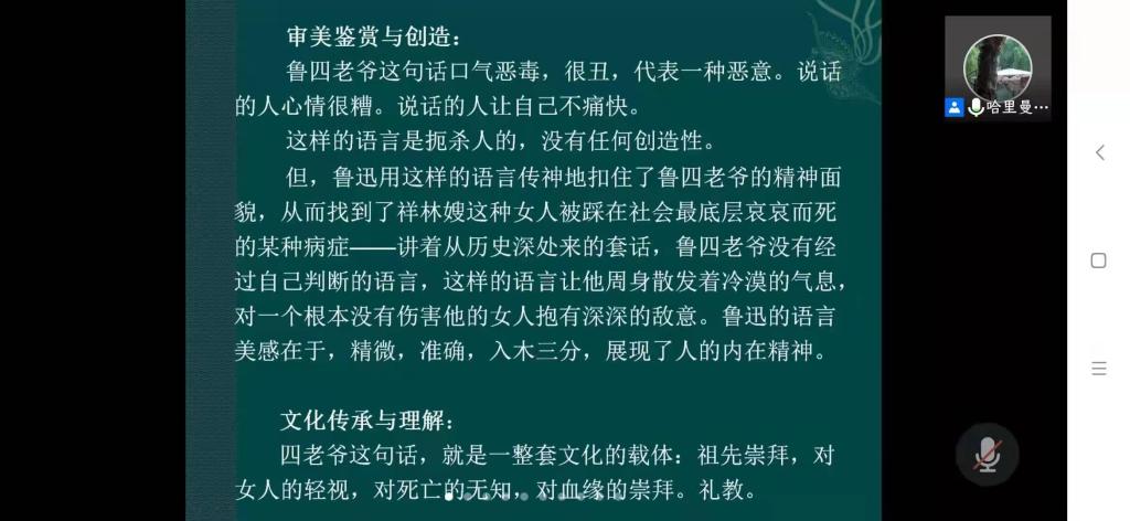 首先,霍军老师强调了语文学科核心素养的重要性,他认为语言架构与运用、思维发展与提升、审美鉴赏与创造、文化传承与理解等核心素养应作为语文教学的标准。同时,霍军老师结合具体课堂教学案例,提出语文核心素养的四个方面不能机械理解,不能割裂四方面内容的联系,在具体课堂教学中要做到互相融合、你中有我、我中有你。随后,霍军老师还运用语文核心素养,结合“重庆公交车”事件,阐述了语言的艺术与语言教学的重要作用;以苏格拉底课堂教学实录为例,提出征询式提问有利于员工创造力的发挥,避免僵死的教学语言以及课堂上单方面的压制。此外,霍军老师还用《祝福》和《水浒传》为具体案例,带领同学们就语文课文解读和语言教学设计方面更加深入理解语文学科核心素养四点内容的关系,并传授了实用的课堂教学技巧。