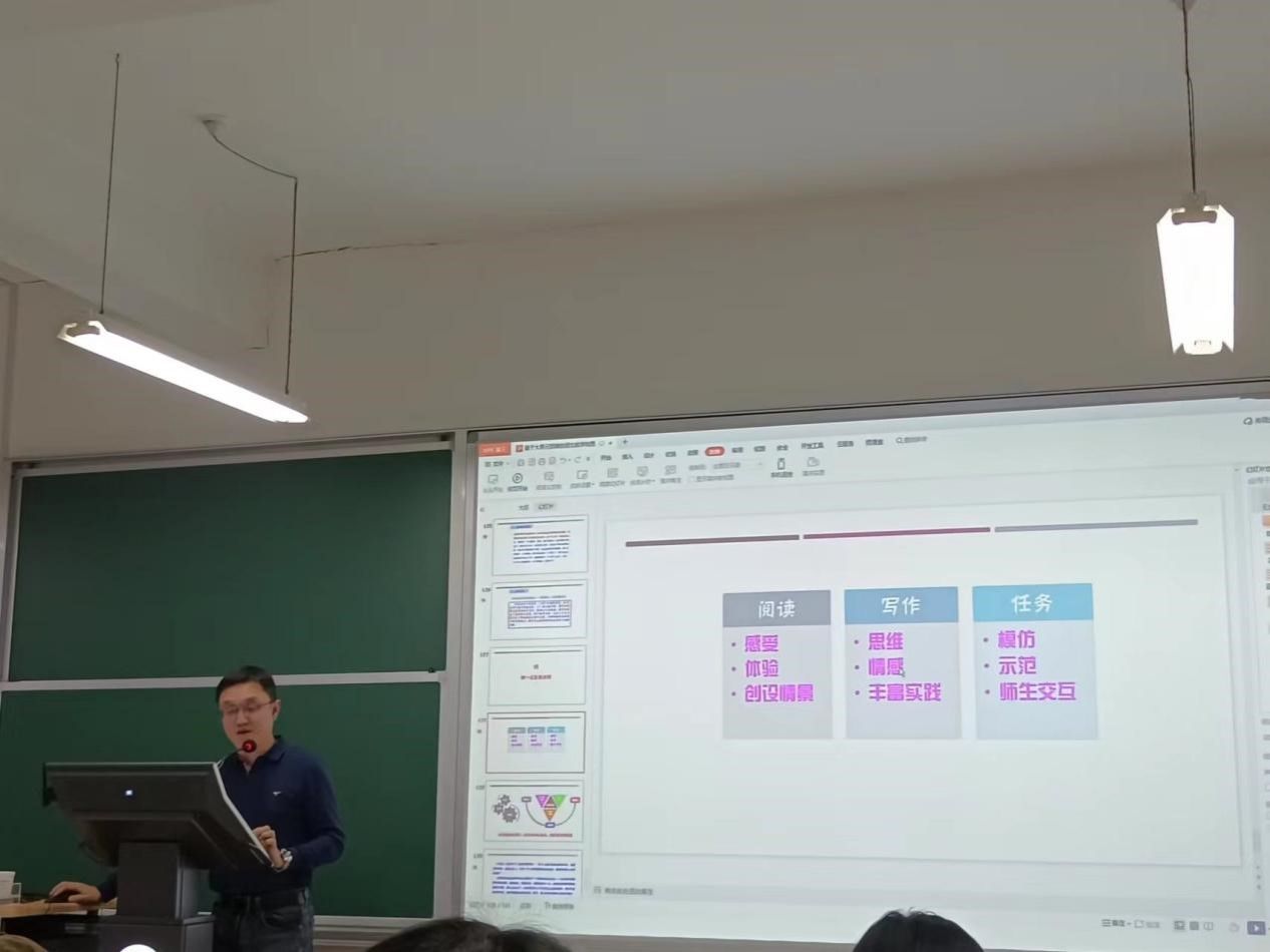 马老师的报告包括三部分:大单元思维的基础;培养写作感受力解决阅读问题的相关课例;提升阅读思维解决写作问题。马老师明确了大单元的“真”的特点,并提出了大单元教学必须在单篇阅读的基础上进行,符合员工的接受能力水平。马老师认为,单元教学必须基于考情,把握方向,大单元教学应聚焦关键能力的养成,贯穿“迁移”能力的训练;基于学科,把握思维,大单元教学应并重阅读、写作教学,力求实现读写交互;基于教材,把握方法,大单元教学应设计实践学习任务,以任务来驱动课堂。