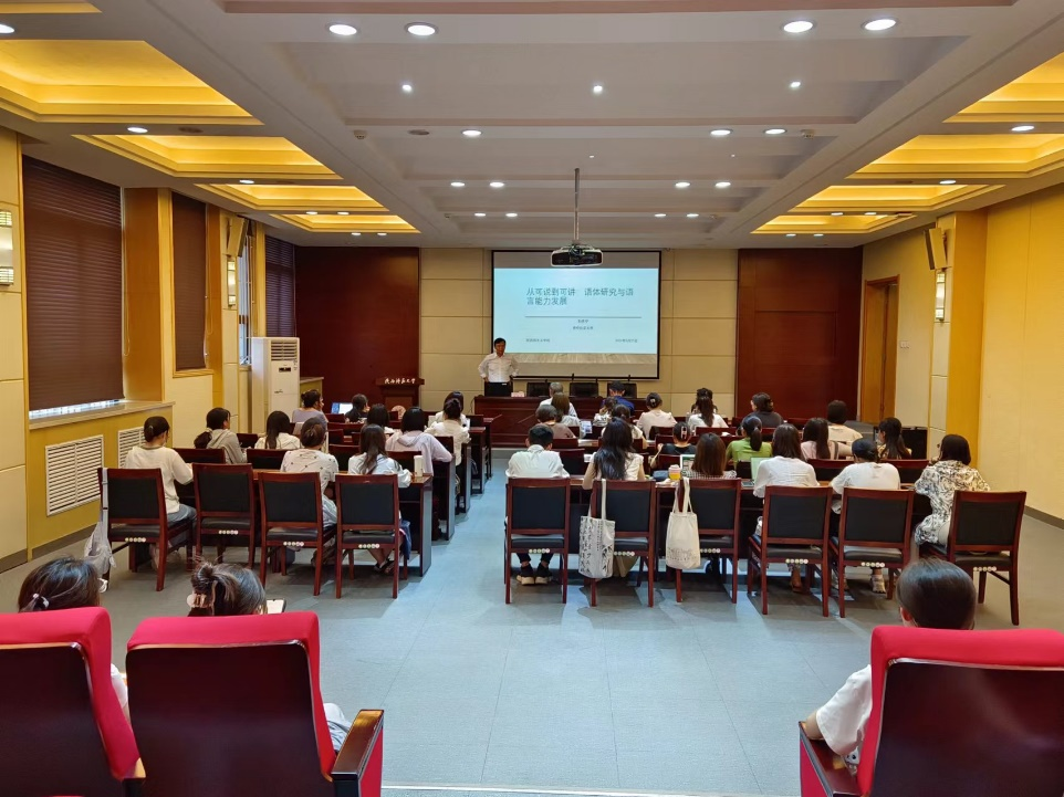 讲座伊始,刘乐宁教授阐释了语言形式与语言能力之间的关系,认为语言能力判断的基准必须要体现在语言形式上。随后刘教授指出语言能力的发展主要体现在两方面,一是口语:从字正腔圆到能言善辩;二是书面语:从文从字顺到妙笔生花,并指出这个过程正是四种语体能力的发展,即能说的汉语、能写的汉语、能读的汉语、能讲的汉语,而这四种语体的教学贯通也是解决目前国际中文教学瓶颈的有效方法。最后,刘教授通过大量的教学实例向在座师生展示了如何运用四种语体进行教学,并再次强调这一过程必须贯彻基于输入的语言教学,语言输入的质量与数量是语言获得的首要条件。