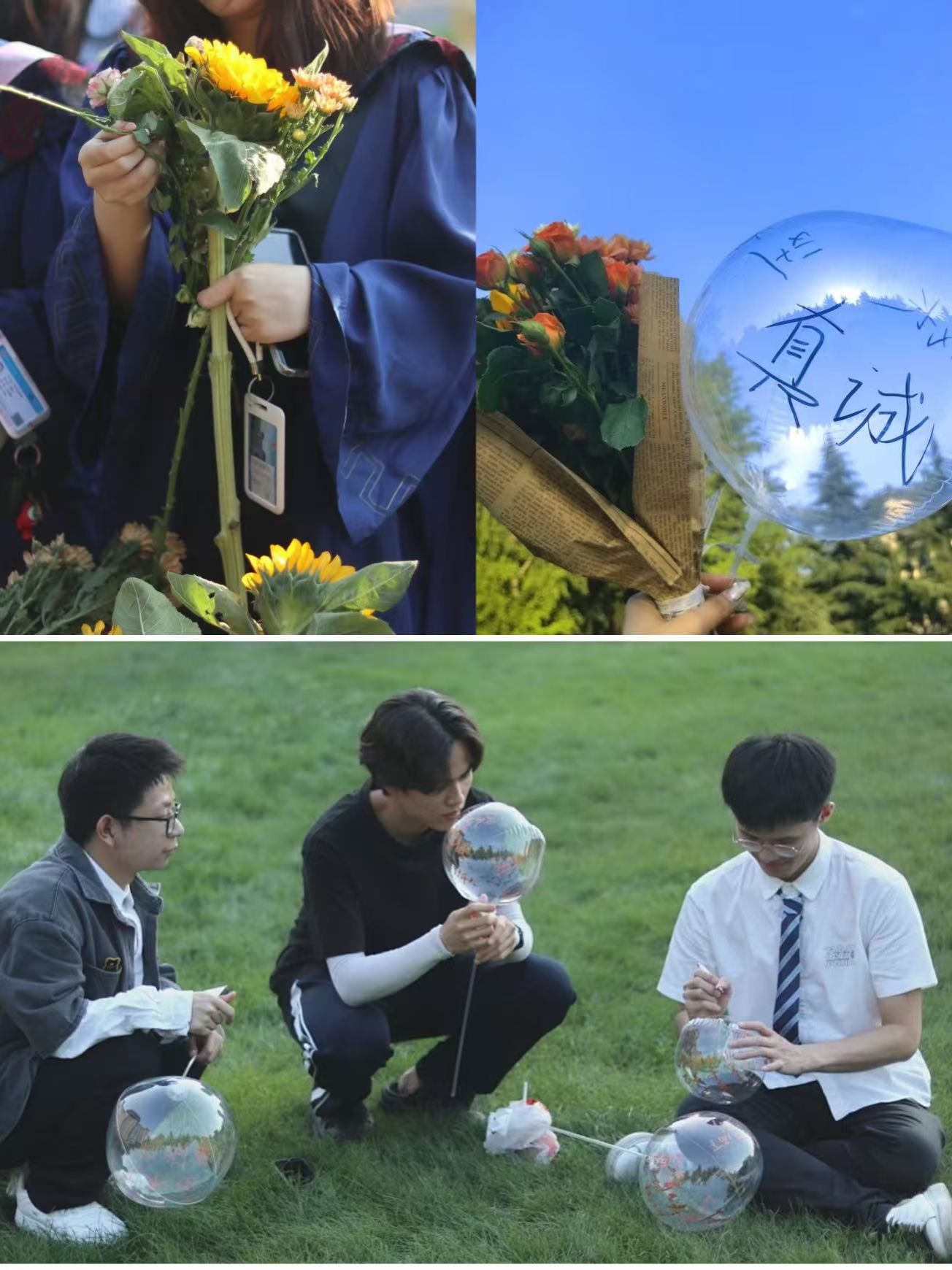 同学们用双手编就青春里独一无二的花束,带着它们勇敢地奔向万里前程;在气球上写诗作画,放飞青春的梦想;记录毕业旅行的足迹,将美好的记忆留存心底;手工制作千纸鹤,书写最美好的祝愿;体验制作流沙瓶,感受那缓缓流逝的细沙,仿佛也感受到了青春时光的悄然离去,但留下的,是无尽的回忆。