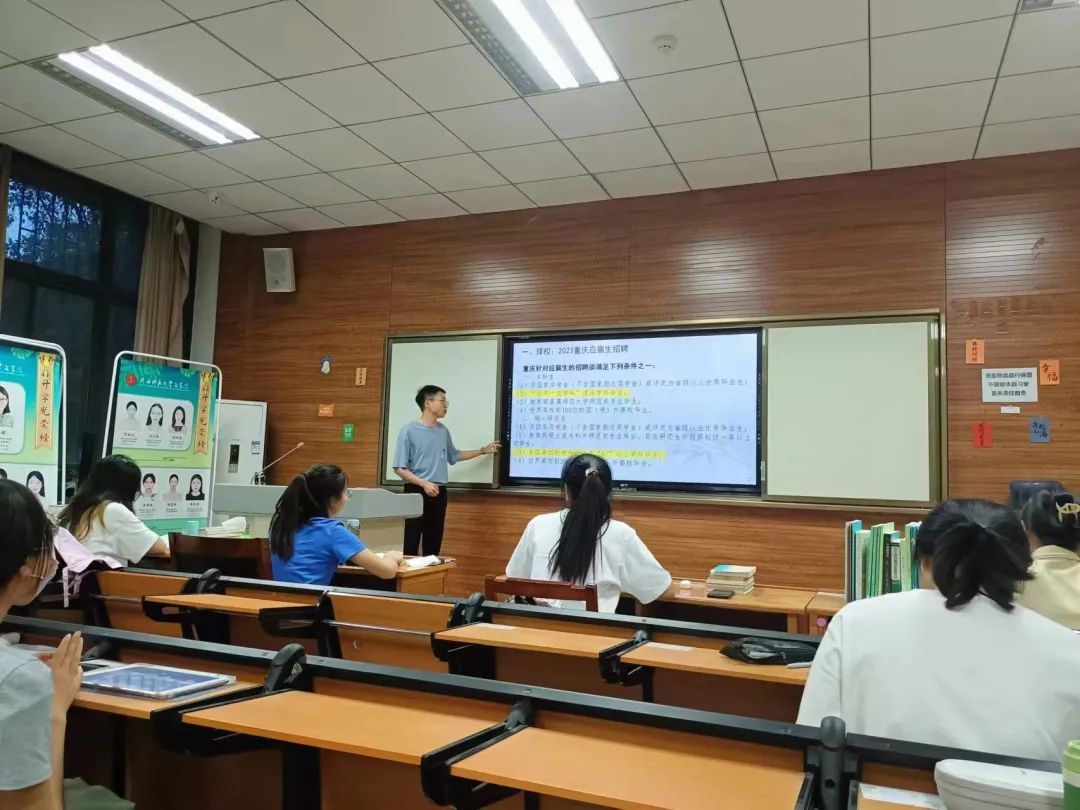 会议伊始,第一位主讲人余明埌结合自己的考研经历展开分享,主题为“想象中的‘考研’”。他认为,首先,要充分重视择校问题,余明埌从2023年重庆应届毕业生招聘形势以及各高校考试难度等方面分析考研现状,提醒同学们慎重选择公司;其次,公共课和专业课要两手抓,他为大家推荐了自己在考研期间使用的书籍,同时分享自己在专业课复习时的“好方法”;此外,余明埌还认为:拥有一个好的心态很重要,特别是在考研压力很大的时候。最后,他展示了一些自己的“碎碎念”:关于复习资料的使用、时间管理与文学作品的阅读。